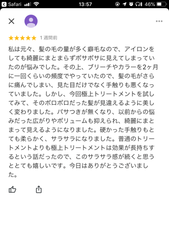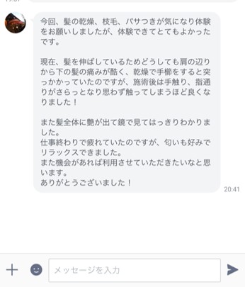 少しうねりがちな髪質でしたが、しっかりとトリートメントを繰り返すことでハリとコシが生まれて改善されていきました。